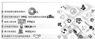 專家預(yù)測(cè),到2050年全球能源互聯(lián)網(wǎng)初步建成時(shí),清潔能源比重將達(dá)到80%,每年可替代相當(dāng)于240億噸標(biāo)準(zhǔn)煤的化石能源,減排二氧化碳670億噸。屆時(shí),全球溫升控制在2攝氏度以內(nèi)的目標(biāo)有望實(shí)現(xiàn)。這一發(fā)展低碳經(jīng)濟(jì)、實(shí)現(xiàn)能源變革轉(zhuǎn)型的系統(tǒng)性解決方案,贏得潘基文、世界銀行行長(zhǎng)金墉、美國能源部長(zhǎng)莫尼茲等的高度贊賞和積極支持。