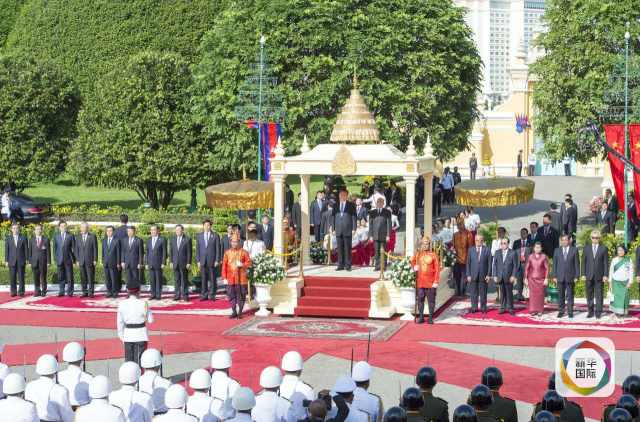 習(xí)近平出席西哈莫尼在王宮舉行的盛大歡迎儀式。(新華社記者姚大偉攝)