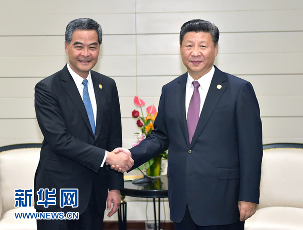 11月20日,國家主席習近平在秘魯首都利馬會見前來出席亞太經合組織第二十四次領導人非正式會議的香港特別行政區(qū)行政長官梁振英。新華社記者 李濤 攝