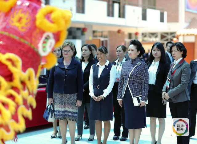 ??? 彭麗媛隨后觀看了具有傳統(tǒng)中國特色的舞獅表演。學生們在鼓樂聲中舞起紅、黃等不同顏色的獅子。彭麗媛駐足欣賞。