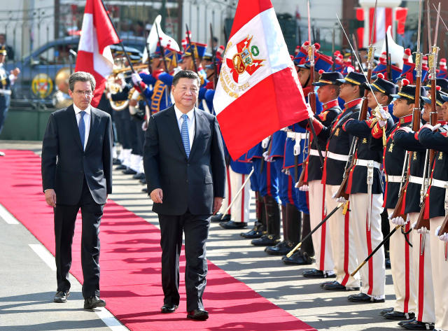11月21日,國(guó)家主席習(xí)近平在利馬會(huì)見秘魯國(guó)會(huì)主席薩爾加多。習(xí)近平抵達(dá)國(guó)會(huì)時(shí),軍樂(lè)隊(duì)奏歡迎曲。習(xí)近平檢閱儀仗隊(duì)。(新華社記者 李濤 攝)