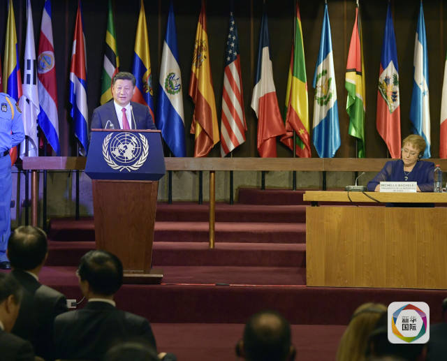 國家主席習(xí)近平在圣地亞哥聯(lián)合國拉丁美洲和加勒比經(jīng)濟(jì)委員會總部出席中拉媒體領(lǐng)袖峰會開幕式。智利總統(tǒng)巴切萊特陪同出席。在熱烈的掌聲中,習(xí)近平發(fā)表題為《開創(chuàng)中拉媒體合作新局面》的致辭。(新華社記者王曄攝)