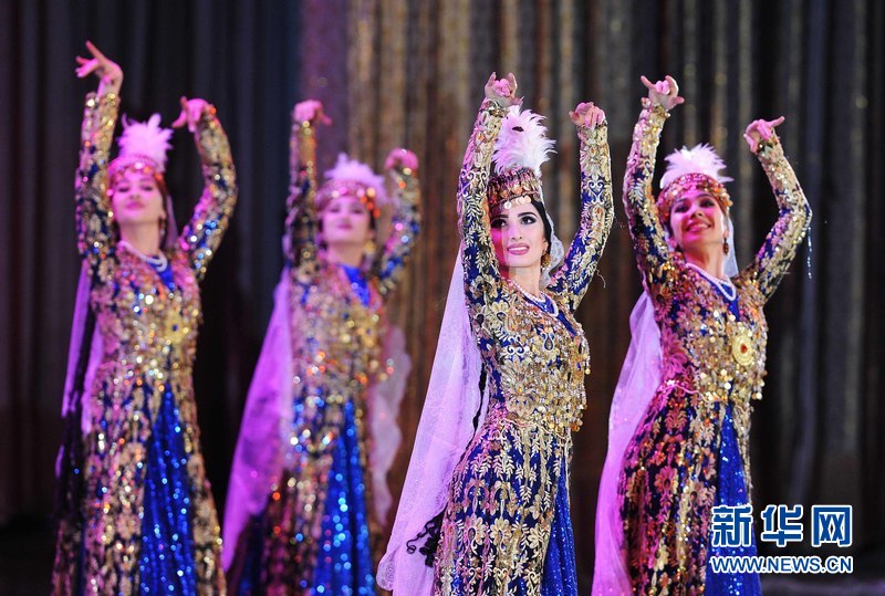 1月18日晚,烏茲別克斯坦首都塔什干人民友誼宮,烏茲別克斯坦舞蹈演員在表演中烏傳統(tǒng)舞蹈。 新華網(wǎng)記者 沙達(dá)提 攝