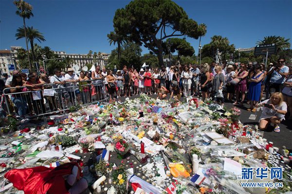 7月16日,在法國南部城市尼斯,人們聚集在恐怖襲擊發(fā)生地英國人漫步大道悼念遇難者。新華社記者 徐金泉 攝