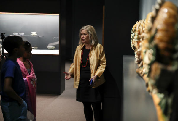 勞里·巴恩斯正在展館內向小學生介紹中國文物。(新華社記者王迎攝)