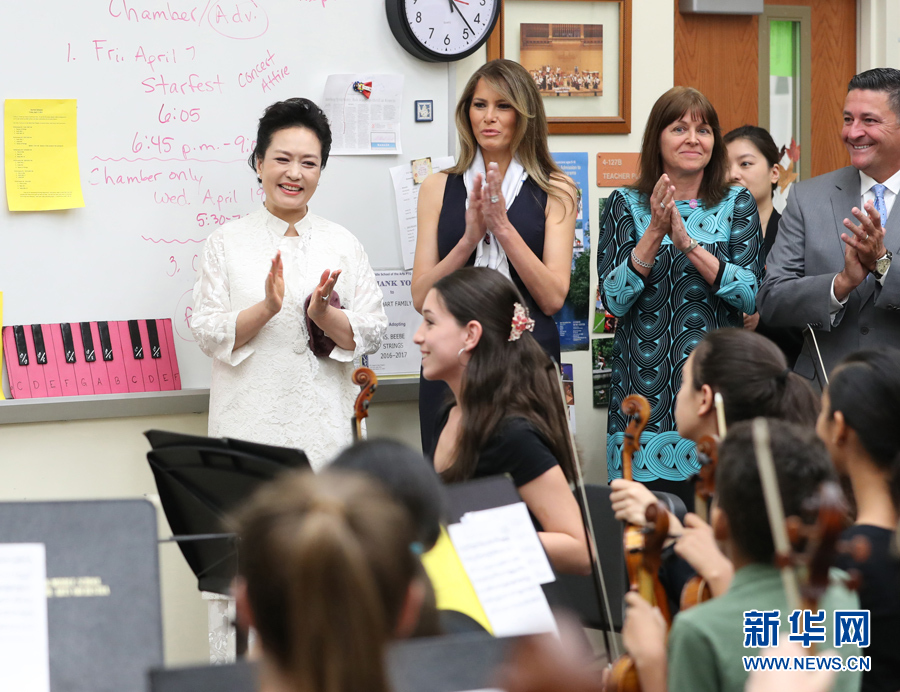 彭麗媛抵達(dá)時(shí),梅拉尼婭和棕櫚灘郡學(xué)區(qū)長阿沃莎、巴克藝術(shù)中學(xué)校長羅贊基等在停車處熱情迎接。彭麗媛先后參觀了聲樂教室、交響樂隊(duì)教室、弦樂教室,欣賞學(xué)生演唱和樂隊(duì)表演,并同學(xué)生們親切互動(dòng)交流。隨后,彭麗媛觀摩了時(shí)政經(jīng)濟(jì)課,回答了學(xué)校小記者關(guān)于“你和藝術(shù)的淵源”的提問,并接受了學(xué)生自己創(chuàng)作的水彩畫。彭麗媛表示,中美兩國可以加強(qiáng)藝術(shù)交流合作。希望巴克藝術(shù)中學(xué)的老師和同學(xué)們以教育和藝術(shù)為橋梁,為增進(jìn)中美兩國人民友好、推動(dòng)兩國關(guān)系發(fā)展作出更多貢獻(xiàn)。