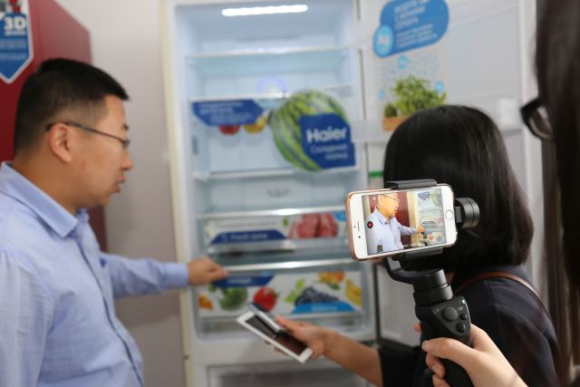 海爾在俄羅斯韃靼斯坦共和國(guó)的冰箱工廠內(nèi),海爾員工介紹冰箱功能。(新華社記者趙宇攝)