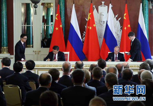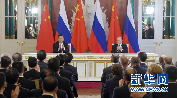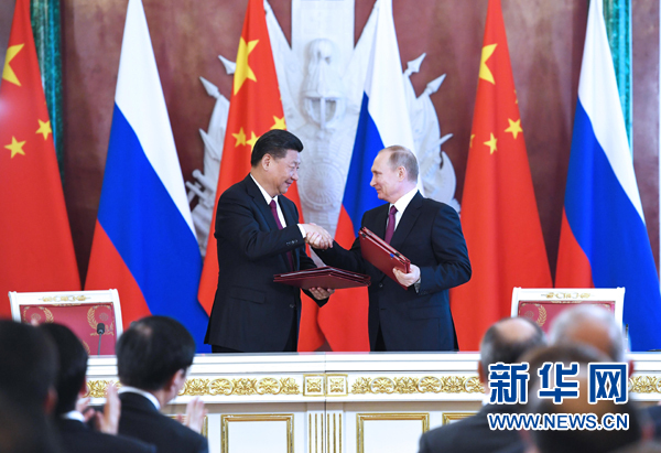 7月4日,國家主席習近平在莫斯科克里姆林宮同俄羅斯總統(tǒng)普京舉行會談。會談后,兩國元首簽署了《中華人民共和國和俄羅斯聯(lián)邦關(guān)于進一步深化全面戰(zhàn)略協(xié)作伙伴關(guān)系的聯(lián)合聲明》《中華人民共和國和俄羅斯聯(lián)邦關(guān)于當前世界形勢和重大國際問題的聯(lián)合聲明》,批準了《〈中華人民共和國和俄羅斯聯(lián)邦睦鄰友好合作條約〉實施綱要(2017年至2020年)》并見證了《中華人民共和國外交部和俄羅斯聯(lián)邦外交部關(guān)于朝鮮半島問題的聯(lián)合聲明》以及經(jīng)貿(mào)、農(nóng)業(yè)、能源、基礎(chǔ)設(shè)施建設(shè)、金融、文化、創(chuàng)新、媒體、信息網(wǎng)絡(luò)、檢驗檢疫等領(lǐng)域多項雙邊合作文件的交換。新華社記者 謝環(huán)馳 攝