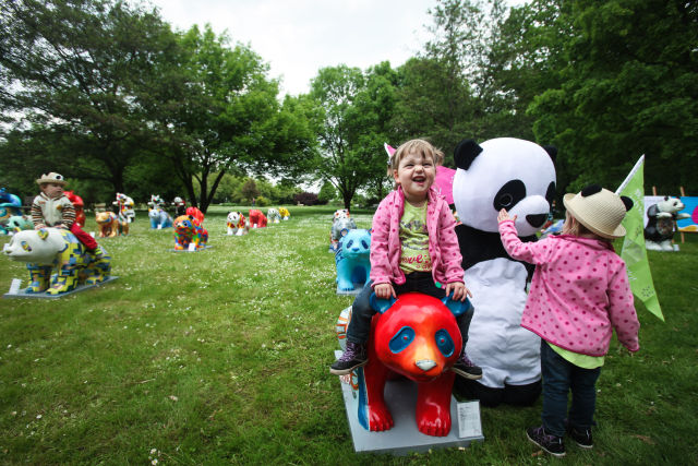 德國柏林世界公園展出中國大熊貓雕塑作品的資料照片。(新華社記者張帆攝)