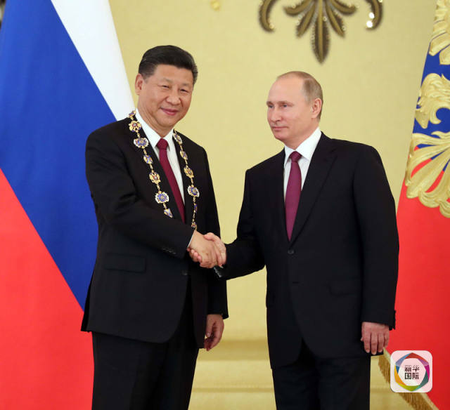 4日下午會(huì)談結(jié)束后,普京總統(tǒng)向習(xí)近平主席授予俄羅斯國(guó)家最高榮譽(yù)勛章——“圣安德烈”勛章。