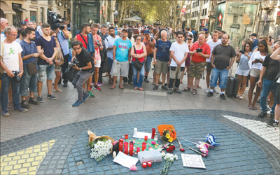 西班牙巴塞羅那恐襲事件后,受害者家屬紛紛在蘭布拉斯大街舉行悼念活動(dòng),街上行人自發(fā)停下腳步表示哀悼和慰問。記者 王 迪攝