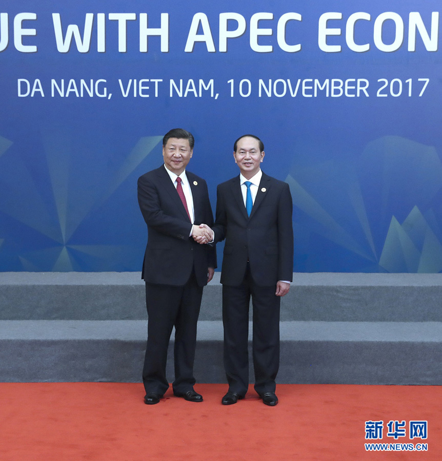 11月10日,國家主席習(xí)近平在越南峴港出席亞太經(jīng)合組織領(lǐng)導(dǎo)人同工商咨詢理事會代表對話會。這是對話會開始前,習(xí)近平受到越南國家主席陳大光的迎接。新華社記者 馬占成 攝