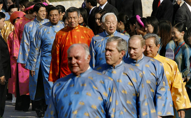 2006年,APEC領(lǐng)導(dǎo)人非正式會(huì)議在越南舉辦。當(dāng)年,各經(jīng)濟(jì)體領(lǐng)導(dǎo)人穿的是越南傳統(tǒng)服裝——奧黛。