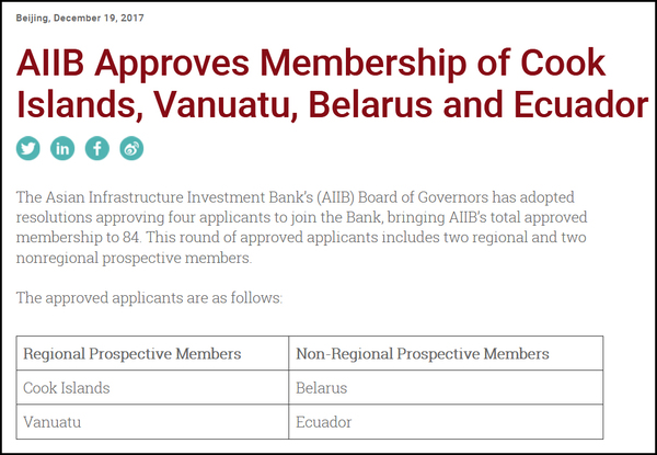 【第四次“擴(kuò)容”】2017年12月19日,亞投行宣布批準(zhǔn)庫(kù)克群島、瓦努阿圖、白俄羅斯和厄瓜多爾四個(gè)成員的加入申請(qǐng),成員增至84個(gè),這是亞投行自開業(yè)以來的第四次“擴(kuò)容”。圖為亞投行官網(wǎng)截圖。(新華網(wǎng)國(guó)際頻道 徐海知)