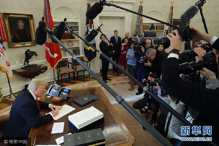 當(dāng)?shù)貢r間22日,美國華盛頓,美國總統(tǒng)特朗普在白宮的橢圓形辦公室簽署1.5萬億美元稅改法案,此乃美國最近逾30年來最大規(guī)模減稅行動。(圖片來源:視覺中國)