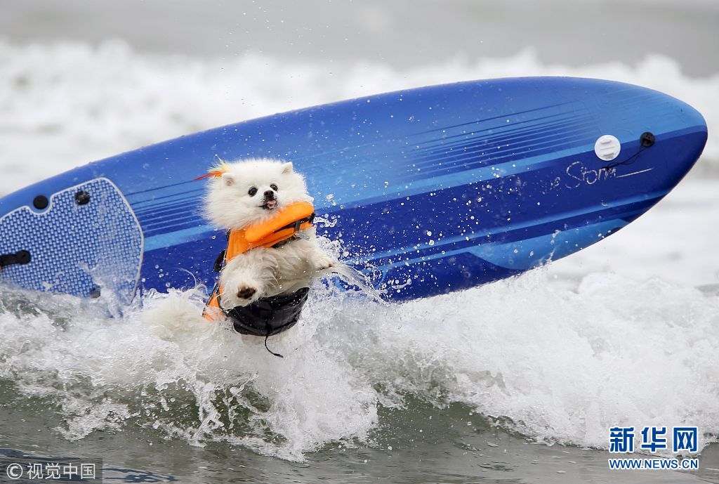 當(dāng)?shù)貢r間2015年8月1日,美國加利福尼亞州因皮里爾灘舉辦第十屆狗狗沖浪比賽,可愛“汪星人”海浪中展開激烈角逐。(圖片來源:視覺中國)