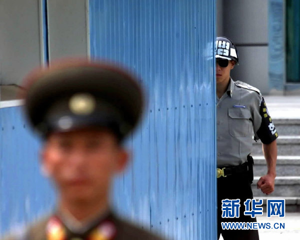 2002年9月19日拍攝的資料照片顯示,一名韓國憲兵(右)和一名朝鮮人民軍士兵在板門店朝鮮半島軍事分界線兩側(cè)執(zhí)勤。 新華社記者龔兵攝