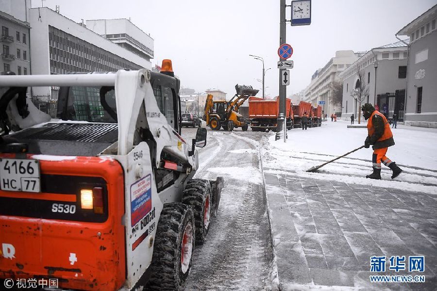 當(dāng)?shù)貢r(shí)間1月20日,俄羅斯莫斯科,工作人員在清理街道上的積雪。 (圖片來(lái)源:視覺(jué)中國(guó))