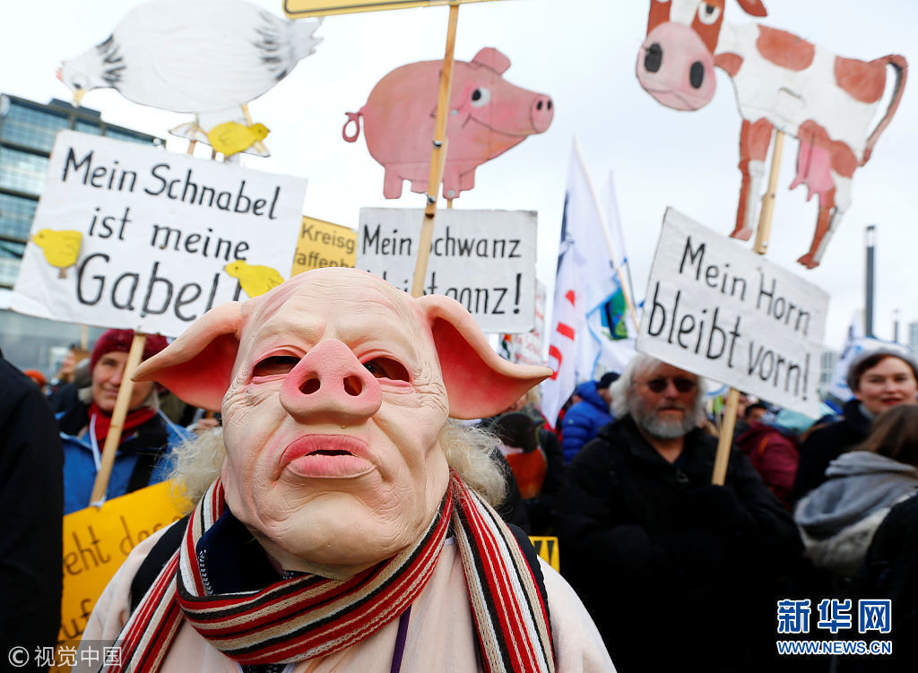 當(dāng)?shù)貢r間1月20日,德國柏林,農(nóng)民們裝扮成家畜游行,抗議柏林國際綠色周舉行,要求更多生態(tài)農(nóng)業(yè)項目。 (圖片來源:視覺中國)