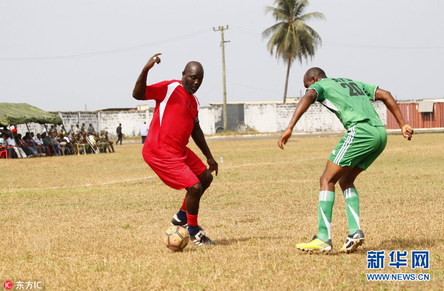 1月20日,利比里亞首都蒙羅維亞,利比里亞當(dāng)選總統(tǒng)、前世界足球先生喬治-維阿參加慈善足球比賽,率領(lǐng)維阿全明星隊對戰(zhàn)利比里亞武裝部隊士兵隊。喬治-維阿在去年12月27日當(dāng)選利比里亞新一任總統(tǒng),并將于2018年1月22日就職。(圖片來源:東方IC)