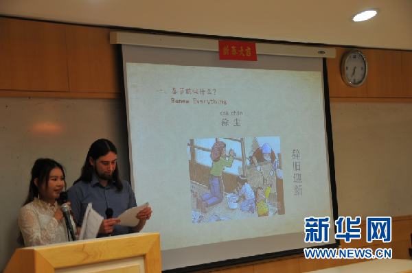 活動現(xiàn)場,女主持人劉津巧介紹春節(jié)的傳統(tǒng)習俗。新華網發(fā) 劉學攝
