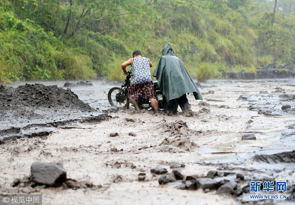 當?shù)貢r間2018年1月27日,菲律賓阿爾拜省,民眾穿過混合著火山灰的泥漿河。(圖片來源:視覺中國)
