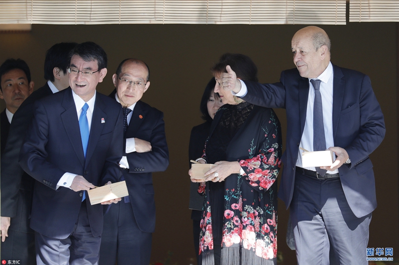 當(dāng)?shù)貢r(shí)間2018年1月27日,日本東京,日本外相河野太郎接待到訪的法國外長讓·伊夫·勒德里昂及其夫人,帶其參觀赤坂宮,體驗(yàn)喂魚。(圖片來源:東方ic)