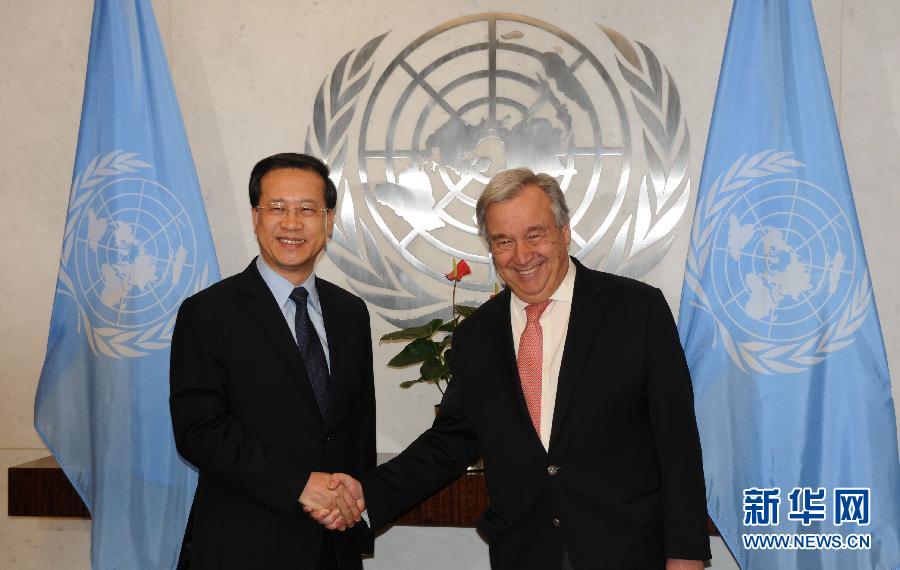 1月30日,在美國紐約,中國新任常駐聯(lián)合國代表馬朝旭(左)與聯(lián)合國秘書長古特雷斯握手。中國新任常駐聯(lián)合國代表馬朝旭30日說,中囯將同囯際社會一道,共同努力推動聯(lián)合國為維護(hù)世界和平、促進(jìn)共同發(fā)展發(fā)揮更大作用。新華社記者馬建國攝