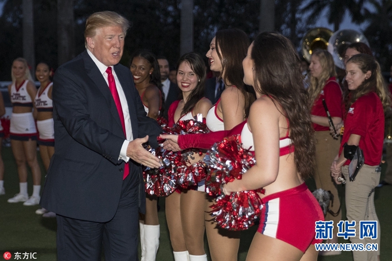 當?shù)貢r間2018年2月4日,美國佛州西棕櫚灘,美國總統(tǒng)特朗普與第一夫人梅拉尼婭在高爾夫俱樂部觀看大學生樂隊的歡迎演出,與美女啦啦隊員握手。據(jù)悉,特朗普夫婦出席在該俱樂部舉辦的超級碗派對。(圖片來源:東方IC)