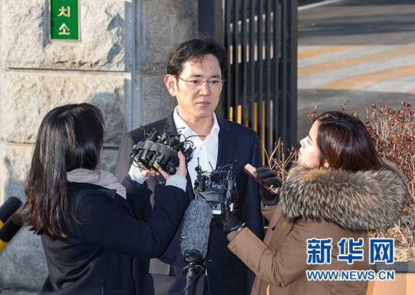 2月5日,韓國(guó)三星電子副會(huì)長(zhǎng)李在镕(中)在位于韓國(guó)儀旺市的拘留所外接受記者采訪。新華社發(fā)(李相浩 攝)