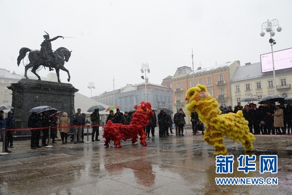 當?shù)貢r間12日中午,來自斯洛伐克中國武術協(xié)會的舞獅表演隊冒雪表演傳統(tǒng)舞獅節(jié)目,中國駐克羅地亞大使胡兆明和薩格勒布市長米蘭·班迪奇為舞獅點睛,熱鬧的鑼鼓和一紅一黃兩頭“獅子”吸引了大批市民駐足觀看。