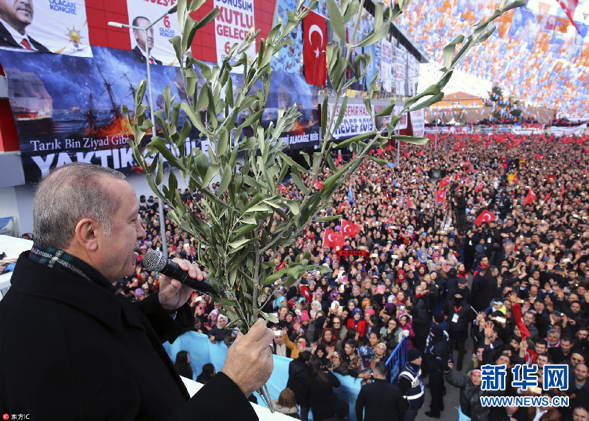 當(dāng)?shù)貢r(shí)間2018年2月17日,土耳其埃斯基謝希爾,土耳其總統(tǒng)埃爾多安出席正義與發(fā)展黨集會(huì),手持橄欖枝發(fā)表講話(huà)。(圖片來(lái)源:東方IC)