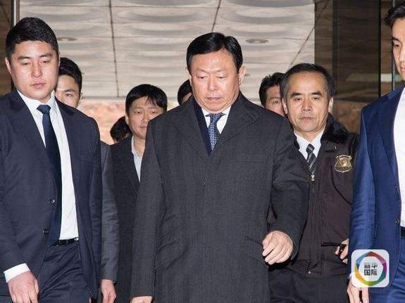 2017年12月22日,辛東彬(中)抵達首爾中央地方法院參加庭審。當(dāng)日,韓國首爾中央地方法院對樂天集團會長辛東彬貪污瀆職案作出一審判決。辛東彬被判處有期徒刑1年8個月,緩刑2年。