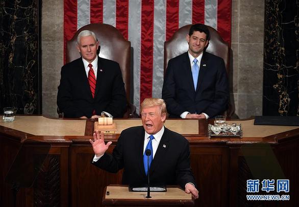 1月30日,美國總統(tǒng)特朗普(前)在華盛頓國會(huì)山發(fā)表其執(zhí)政以來的首次國情咨文演講。新華社記者 殷博古 攝