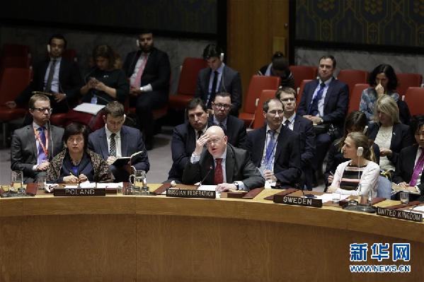 2月24日,在位于紐約的聯(lián)合國總部,俄羅斯常駐聯(lián)合國代表瓦西里·涅邊賈(前中)在安理會通過敘利亞全境停火決議草案后發(fā)言。新華社記者 李木子 攝