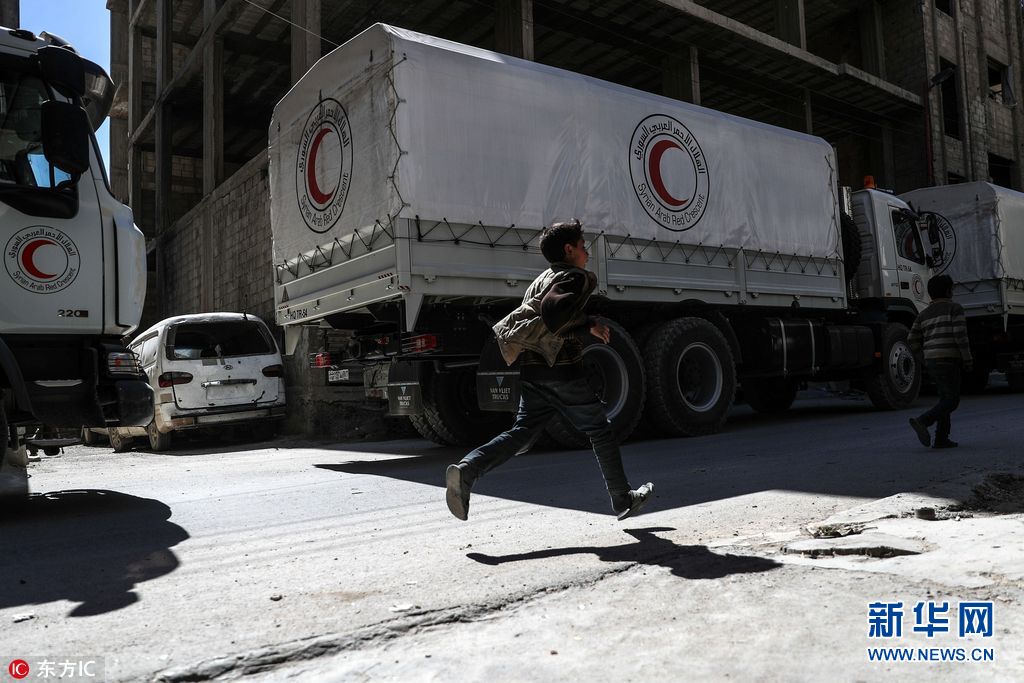 當(dāng)?shù)貢r(shí)間2018年3月9日,敘利亞,推遲多日后,人道主義救援物資進(jìn)入東古塔反政府武裝控制區(qū)并完成卸貨,共13卡車物資當(dāng)天上午從瓦菲丁通道進(jìn)入杜馬區(qū)。(圖片來(lái)源:東方IC)