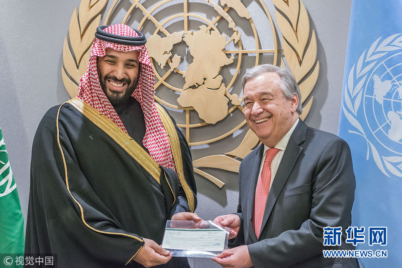 3月27日,美國(guó)紐約,沙特王儲(chǔ)穆罕默德·本·薩勒曼訪問(wèn)聯(lián)合國(guó)總部,簽署向也門人道主義援助計(jì)劃自愿財(cái)政資助備忘錄。(圖片來(lái)源:視覺中國(guó))