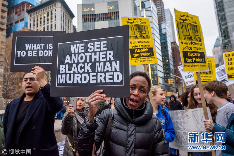 3月28日,美國紐約,數(shù)百民眾走上街頭參加游行,抗議加州黑人男子克拉克(Stephon Clark)遭警方誤殺。(圖片來源:視覺中國)