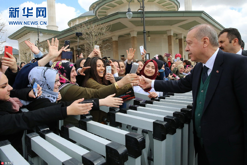 當(dāng)?shù)貢r間3月30日,土耳其安卡拉,土耳其總統(tǒng)埃爾多安在星期五禮拜結(jié)束后與民眾打招呼。(圖片來源:東方IC)
