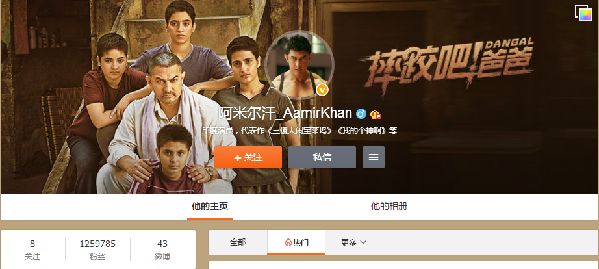 阿米爾·汗在中國(guó)社交媒體上的粉絲數(shù)過(guò)百萬(wàn),