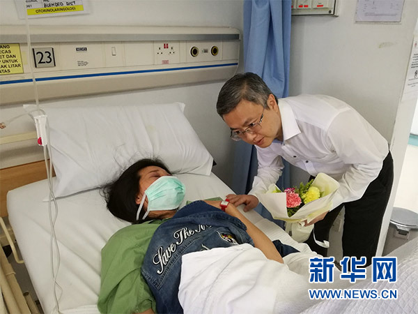 4月7日,在馬來(lái)西亞雪蘭莪州,大使館領(lǐng)保官員在醫(yī)院探望傷者。新華社發(fā)