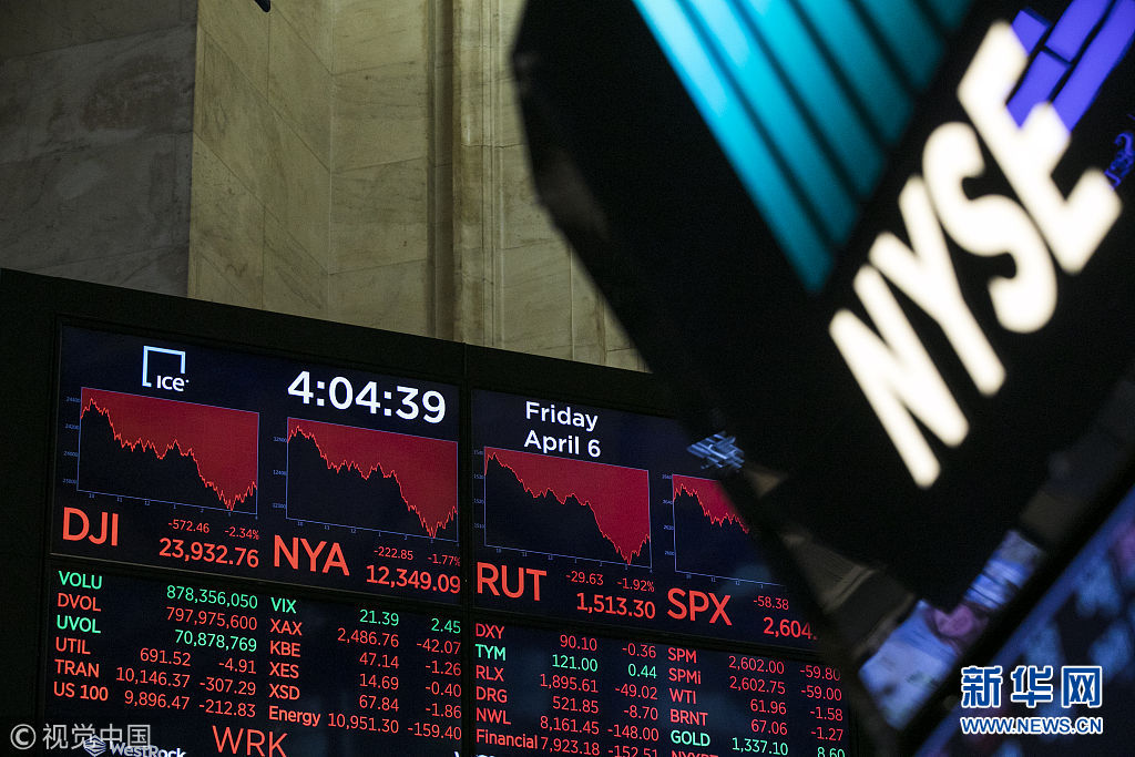 4月6日,美國(guó)紐約,紐約證交所。對(duì)中美貿(mào)易摩擦升級(jí)的擔(dān)憂(yōu)6日彌漫華爾街,美股今天再度走低。道瓊斯工業(yè)指數(shù)當(dāng)天一度下挫接近800點(diǎn)。當(dāng)天,紐約股市三大股指全部收跌。道指報(bào)收于23932.76點(diǎn),跌2.34%;標(biāo)準(zhǔn)普爾500指數(shù)收于2604.47點(diǎn),跌2.19%;納斯達(dá)克綜合指數(shù)收于6915.11點(diǎn),跌2.28%。(圖片來(lái)源:視覺(jué)中國(guó))