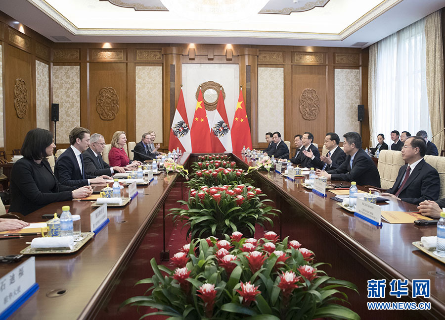李克強(qiáng)歡迎范德貝倫總統(tǒng)和庫爾茨總理聯(lián)袂訪華。他表示,奧地利是中國在歐洲的重要伙伴。習(xí)近平主席同總統(tǒng)先生舉行會(huì)談,共同規(guī)劃兩國關(guān)系未來發(fā)展。中方愿同奧方抓住機(jī)遇,對(duì)接發(fā)展戰(zhàn)略,深化人文交流合作,加強(qiáng)在國際事務(wù)中的溝通協(xié)調(diào),全面提升兩國關(guān)系水平。
