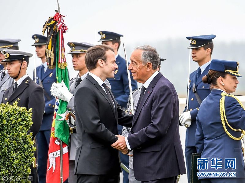 4月9日,法國里什堡,法國總統(tǒng)馬克龍和葡萄牙總統(tǒng)馬塞洛·雷貝洛·德索薩在一戰(zhàn)葡萄牙公墓出席一戰(zhàn)紀(jì)念儀式,紀(jì)念利斯戰(zhàn)役百年。(圖片來源:視覺中國)