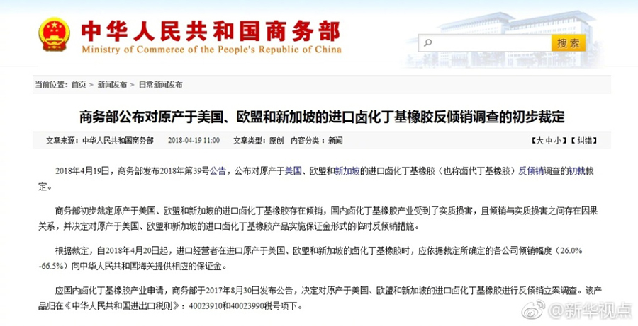 新華網(wǎng)北京4月19日電 商務(wù)部今天發(fā)布公告,初步裁定原產(chǎn)于美國(guó)、歐盟和新加坡的進(jìn)口鹵化丁基橡膠存在傾銷(xiāo)。根據(jù)裁定,自2018年4月20日起,進(jìn)口經(jīng)營(yíng)者在進(jìn)口原產(chǎn)于美國(guó)、歐盟和新加坡的鹵化丁基橡膠時(shí),應(yīng)依據(jù)裁定所確定的各公司傾銷(xiāo)幅度(26.0%-66.5%)向中華人民共和國(guó)海關(guān)提供相應(yīng)的保證金。?(據(jù)新華社“新華視點(diǎn)”微博報(bào)道)