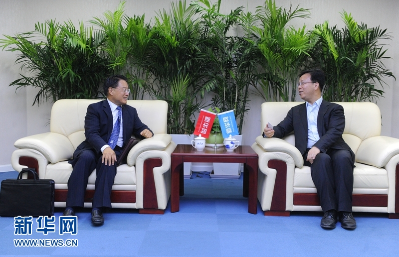 4月24日,聯(lián)合國(guó)工業(yè)發(fā)展組織總干事李勇(左)在北京接受了新華網(wǎng)獨(dú)家專訪。圖為新華網(wǎng)黨委常委、副總編輯劉加文在訪談前會(huì)見(jiàn)李勇。新華網(wǎng)記者 陳競(jìng)超攝