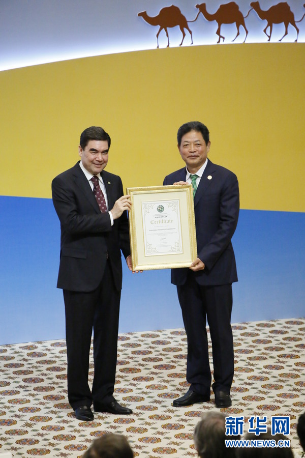 論壇開幕式上,絲綢之路國際總商會主席呂建中代表該商會向別爾德穆哈梅多夫頒發(fā)“復(fù)興絲綢之路榮譽證書”。新華社記者 周良攝