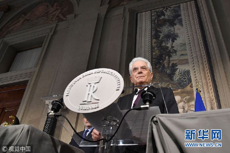當(dāng)?shù)貢r(shí)間2018年5月7日,意大利羅馬,意大利總統(tǒng)塞爾焦·馬塔雷拉7日召集新一輪組閣談判并出席新聞發(fā)布會(huì)。如果所有組閣努力失敗,馬塔雷拉將授權(quán)組建技術(shù)官僚組成的過渡政府。(圖片來源:視覺中國)