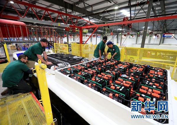 美國(guó)工人在比亞迪工廠(chǎng)內(nèi)忙碌。新華網(wǎng)發(fā) 李穎攝