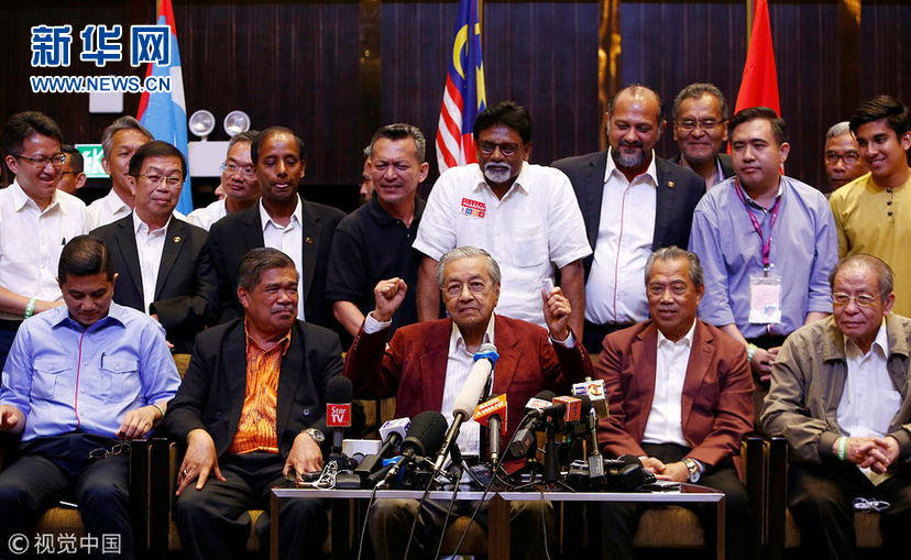 當(dāng)?shù)貢r(shí)間2018年5月9日,馬來(lái)西亞吉隆坡,馬哈蒂爾代表希望聯(lián)盟召開新聞發(fā)布會(huì)。9日,馬來(lái)西亞國(guó)會(huì)大選結(jié)束。10日凌晨官方點(diǎn)票結(jié)果顯示,前總理馬哈蒂爾(Mahathir)帶領(lǐng)的希望聯(lián)盟取得112席簡(jiǎn)單多數(shù)國(guó)會(huì)議席,足以籌組政府及勝出大選,并終結(jié)執(zhí)政國(guó)民陣線長(zhǎng)達(dá)60年的管治?,F(xiàn)總理納吉布領(lǐng)導(dǎo)的國(guó)民陣線僅獲得76席。(圖片來(lái)源:視覺(jué)中國(guó))